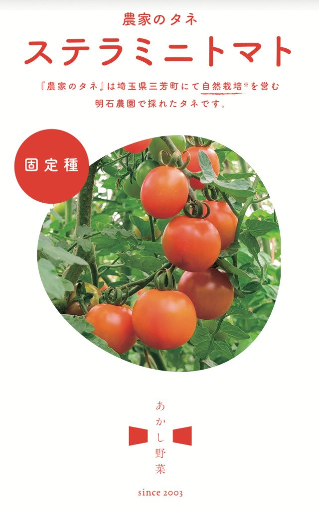 ■種 ステラミニトマト 自然栽培で採種した明石農園のタネ 自然栽培で育てた「ステラミニトマト」の種を、明石農園からお届けします! 2005年から続けてきた自然栽培の実績に基づき、自然環境に適応したこの種は、吸肥力が強く、自然栽培に最適です。 ステラミニトマトは、小粒ながらも甘さと旨味がギュッと詰まっており、家庭菜園でも育てやすく、毎日のお料理に彩りを加えます。お弁当やサラダにのせるだけで、一層華やかになりますよ!新鮮なミニトマトの味わいを、ご自宅で楽しんでみませんか? 種まきは春が最適です。苗を育て、畑に植え付けたら、自然の力を信じて愛情を持って育ててください。農薬を使わないため、健康的に育ったトマトの実が収穫できる喜びを実感できるはずです。 《栽培のポイント》 ①種まき時期 植え付け日の約50日前。収穫日の100日前。 ②発芽地温 地温が20〜30℃植え付け時期 最低気温が10℃を下回らない時期。 ③生育適温 昼間25~30℃、夜間10~15℃ 気温が30℃を超えると超えると実が付きにくくなります。 ④収穫 実が赤く熟したら、収穫のタイミングです!新鮮なトマトをそのままサラダにしたり、ソースにしたりして、乾燥ミニトマトにしたりして、豊かな味わいを楽しんでください。 明石農園の「ステラミニトマト」種を使って、家庭菜園に挑戦してみませんか?自然の恵みを感じながら、育てる楽しさも味わっていただければ嬉しいです。 【名称】 ステラミニトマト 種 【内容量】 0.2ml 約65粒 【種子消毒】 なし 【有効期限】 2026年10月 【採種地】 埼玉県 【製造者】 明石農園 埼玉県三芳町 ※自然栽培とは、農薬や肥料を使用せず、土中微生物や種、土などの力を生かした栽培。